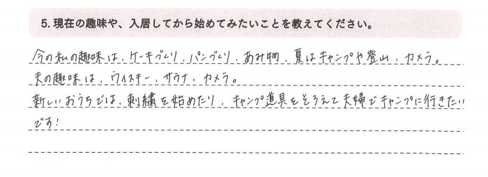 今の私の趣味は、ケーキづくり、パンづくり、編み物、夏はキャンプや登山、カメラ。夫の趣味はウイスキー、サウナ、カメラ。新しいおうちでは、刺繍を始めたり、キャンプ道具をそろえて夫婦でキャンプに行きたいです!