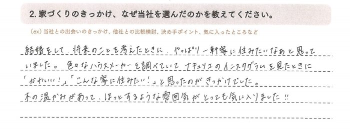 結婚をして、将来のことを考えたときに、やっぱり一軒家に住みたいなぁと思っていました。色々なハウスメーカーを調べていてナチュリエのInstagramを見たときに「かわいい!」「こんな家に住みたい!」と思ったのがきっかけでした。木の温かみがあって、ほっとするような雰囲気がとっても気に入りました‼