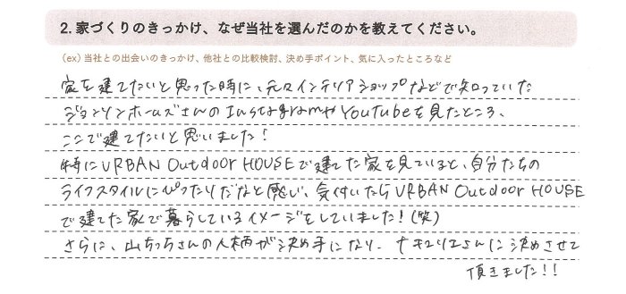 家を建てたいと思った時に、元々インテリアショップなどで知っていたジョンソンホームズさんのInstagramやYouTubeを見たところ、ここで建てたいと思いました! 特にアーバンアウトドアハウスで建てた家を見ていると、自分たちのライフスタイルにぴったりだなと感じ、気付いたらアーバンアウトドアハウスで建てた家で暮らしているイメージをしていました!(笑)