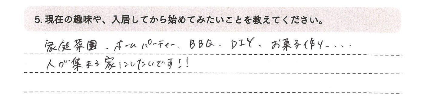 家庭菜園、ホームパーティー、BBQ、DIY、お菓子作り…人が集まる家にしたいです‼