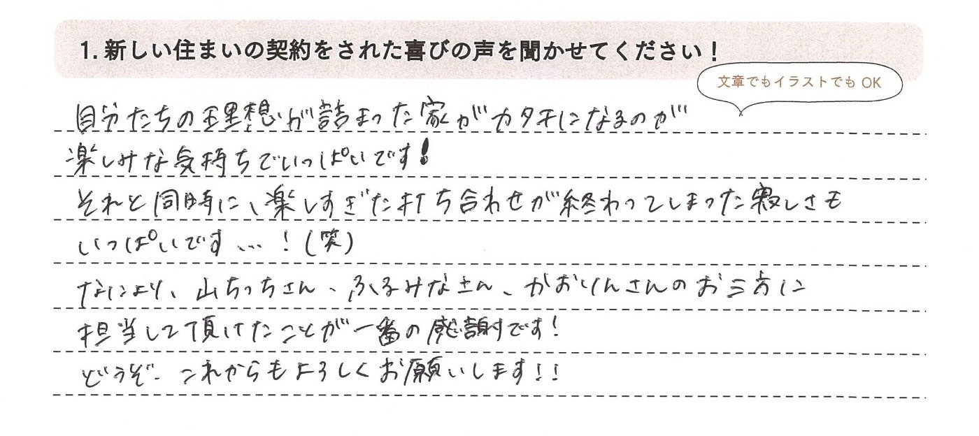 自分たちの理想が詰まった家がカタチになるのが楽しみな気持ちでいっぱいです!それと同時に、楽しすぎた打ち合わせが終わってしまった寂しさもいっぱいです…!(笑)