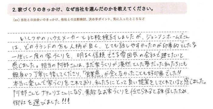 いくつかのハウスメーカーと比較検討しましたが、ジョンソンホームズさんは、どのブランドの方も人柄が良く、