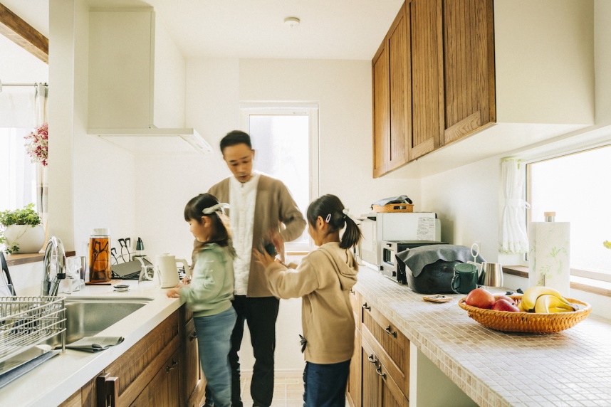 ここはニュータウンで、街並みがとっても綺麗。周りには子どもの友だちが沢山住んでいるので、公園で遊んだり、家を行き来したりと毎日楽しんでいます。主人は前より通勤がちょっと大変になりましたが、夜仕事から帰って来る時、家から漏れる灯りを見るのがうれしいみたい。のどかな暮らしに、私も心に余裕が生まれました。心休まる空間で、家族と過ごす何気ないひと時が幸せです。