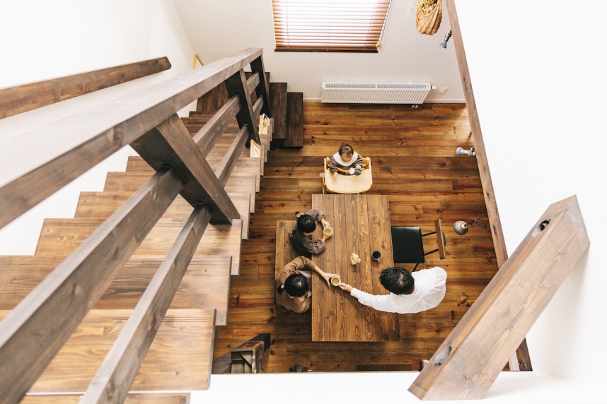 南向きの土地を活かして、いつもあったかい日が入るよう、プランは一から考えました。こだわったのは、吹き抜けとさらし階段。1階のフリースペースもあえてリビングとの仕切りを付けなかったので、家全体が開放的に。日光や空気が循環されている感じがして心地よいです。