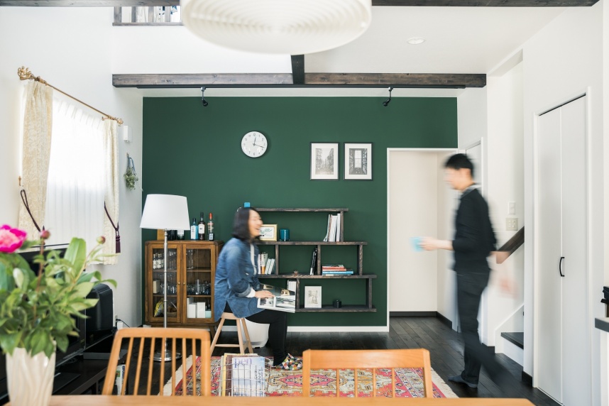 吹き抜けにしたリビングは、壁一面をグリーンに。