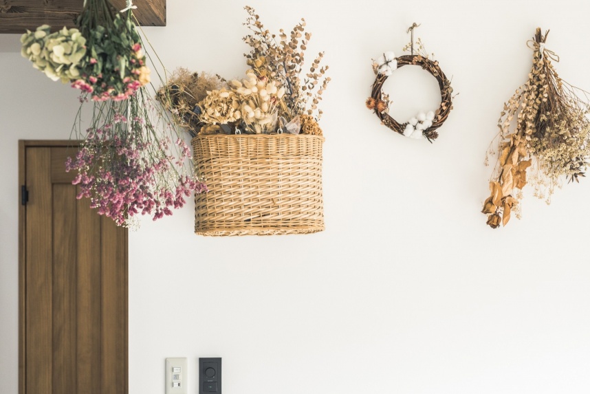 飾っているドライフラワーは結婚式のときの花束や、プレゼントの花束からつくったものです。
