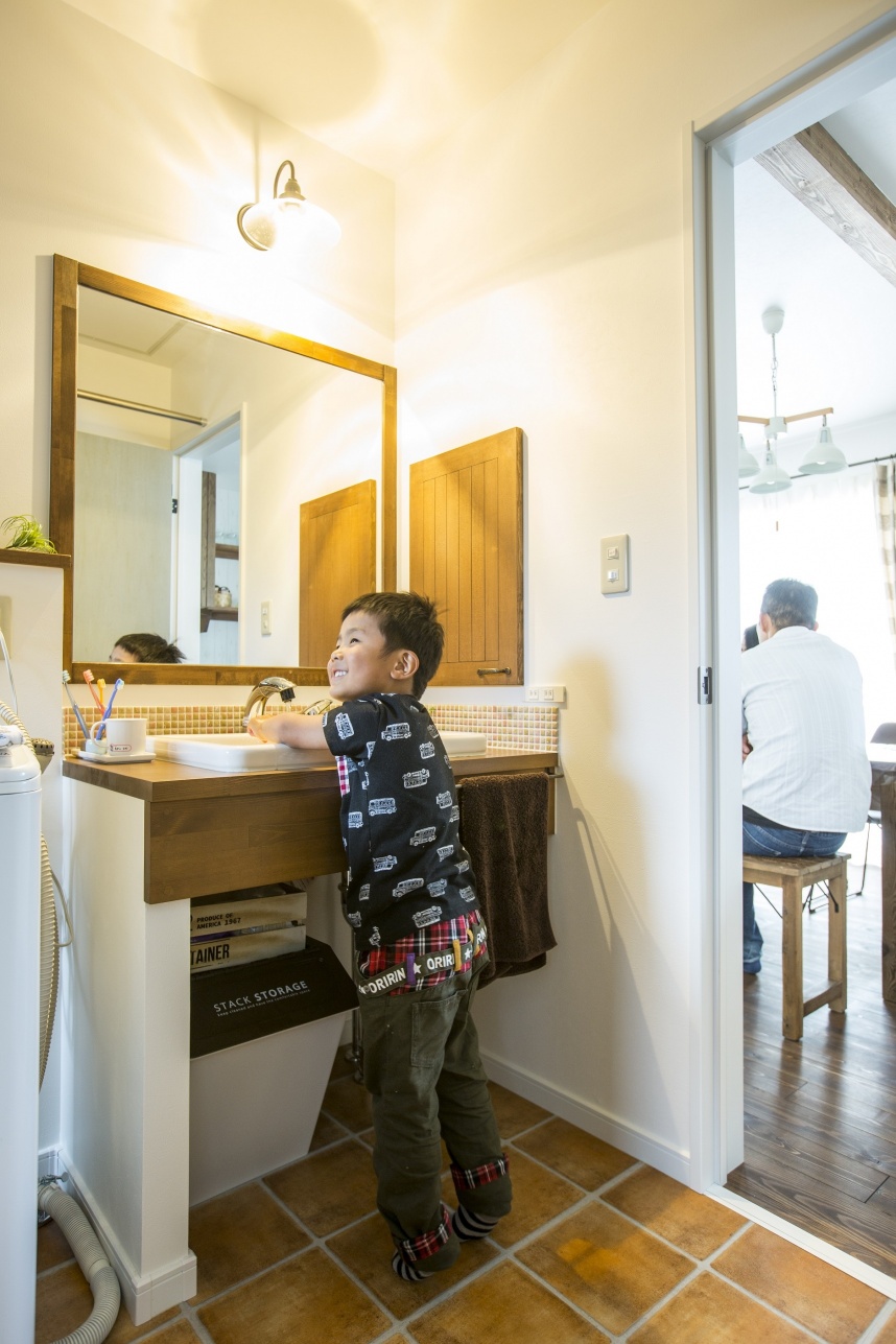 玄関ホールにつけた洗面台もかわいいだけでなくとても実用的で、