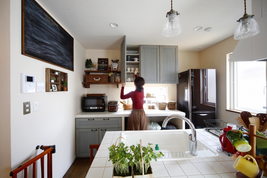 天板はタイル仕上げ、戸棚はシャビー加工し、